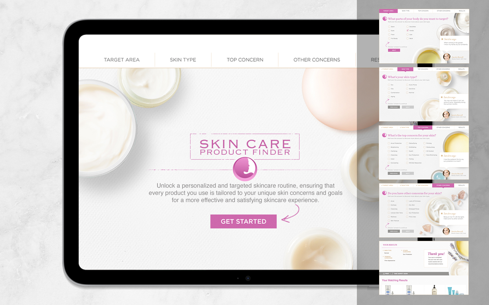 When it comes to beauty products, customers literally have skin in the game—and they’ll swiftly return anything that isn't absolutely perfect. Facing an ever-increasing number of returns, a major retailer needed a way to drastically boost customer confidence before they bought. We developed a product finder that was sound in premise, offering personalized tips and skin recommendations, but the true magic was in the UX design. We ensured the experience was intuitive and simple, leveraging bright layouts, welcoming soft hues, and sassy popping pinks to make the microsite a real draw. This engaging user interface was critical in getting customers to the exact content they needed, successfully turning their product 'finders' into permanent 'keepers.' As the Photo Art Director on set, I ensured the visual execution supported this seamless experience.